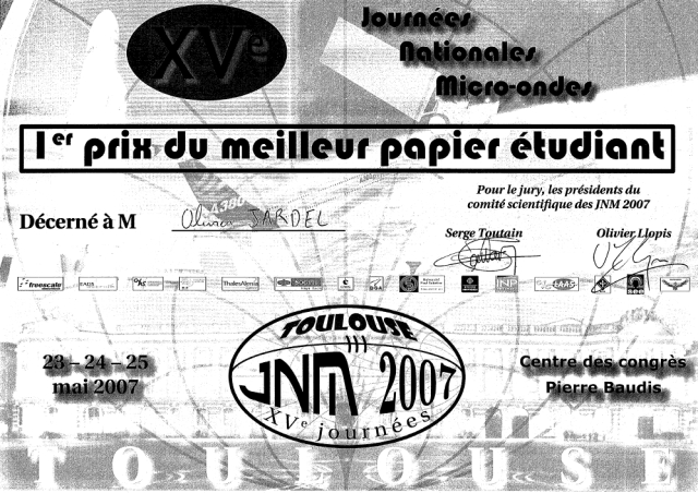 Vendredi 25 Mai 2007 - Prix du meilleur papier étudiant remis à F. De Groote pour l'article :